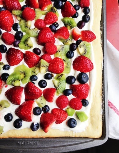 - Cover the pizza with fruit. Refrigerate until serving. Slice into squares.